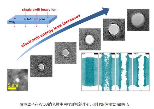 科研人员基于兰州重离子研究装置(HIRFL),利用快重离子作用于WO3纳米片材料,实现了直接“打孔”的制备方法。同时,科研人员利用分子动力学模拟对物理机理进行解释,发现重离子在材料中的沉积能量会引起材料局域瞬时熔融喷发,以及熔融相的粘度和表面张力大小是决定纳米孔形成的关键因素。