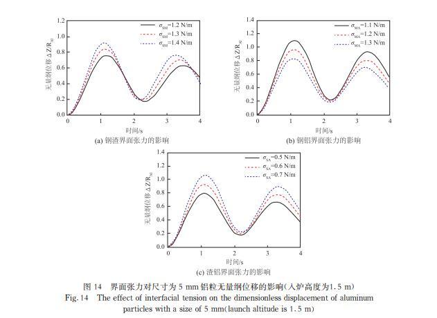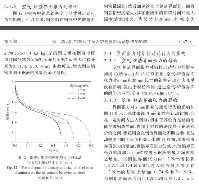 增加钢渣界面张力、减小钢铝界面张力或增加渣铝界面张力有利于铝粒进入钢液,而铝粒的尺寸大于20 mm,界面张力对铝块运动几乎没有影响;增大密度会使钢芯铝在钢液中停留更长时间,有利于钢液脱氧。