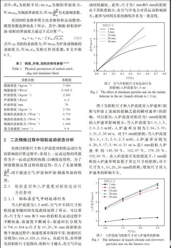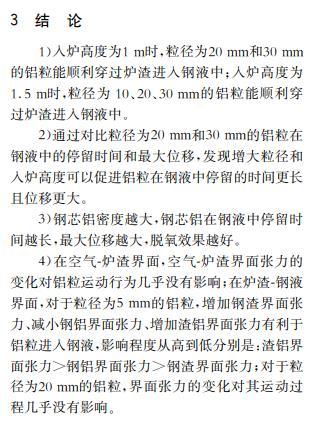 结果表明:在渣层厚度为70 mm且入炉高度为1~1.5 m的情况下,1 mm和5 mm的铝粒在渣钢界面处波动;入炉高度为1 m时,粒径为10 mm的铝粒停留在渣钢界面处,但在入炉高度为1.5 m及以上时可以进入钢液;20 mm及以上尺寸的铝粒可以进入钢液。在入炉高度为1 m时、30 mm尺寸的铝粒在钢液中的停留时间与深度相较于20 mm的基础上分别增加22.86 %和50.00 %;在铝粒尺寸为20 mm时、入炉高度为1.5 m时的铝粒在钢液中的停留时间与深度在1 m的基础上分别增加5.71 %和10.00 %。