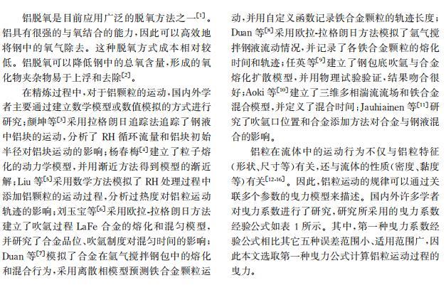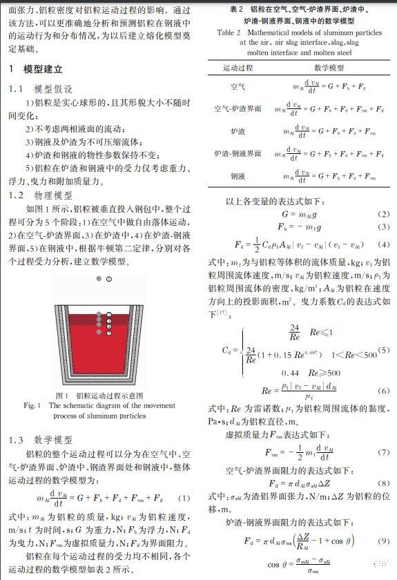 摘要: 二次精炼过程中,铝是钢液进行脱氧及合金化的主要物料之一,但纯铝的密度小于钢液,能否穿越渣层与钢液接触及接触时间对铝的脱氧效果和钢中溶解铝的含量有直接影响。在忽略铝的熔化、溶解及化学反应的情况下,通过对铝粒运动过程受力分析,建立铝粒在气-渣-钢相内的三维运动数学模型,明晰铝粒尺寸及入炉高度对铝粒运动轨迹的影响。