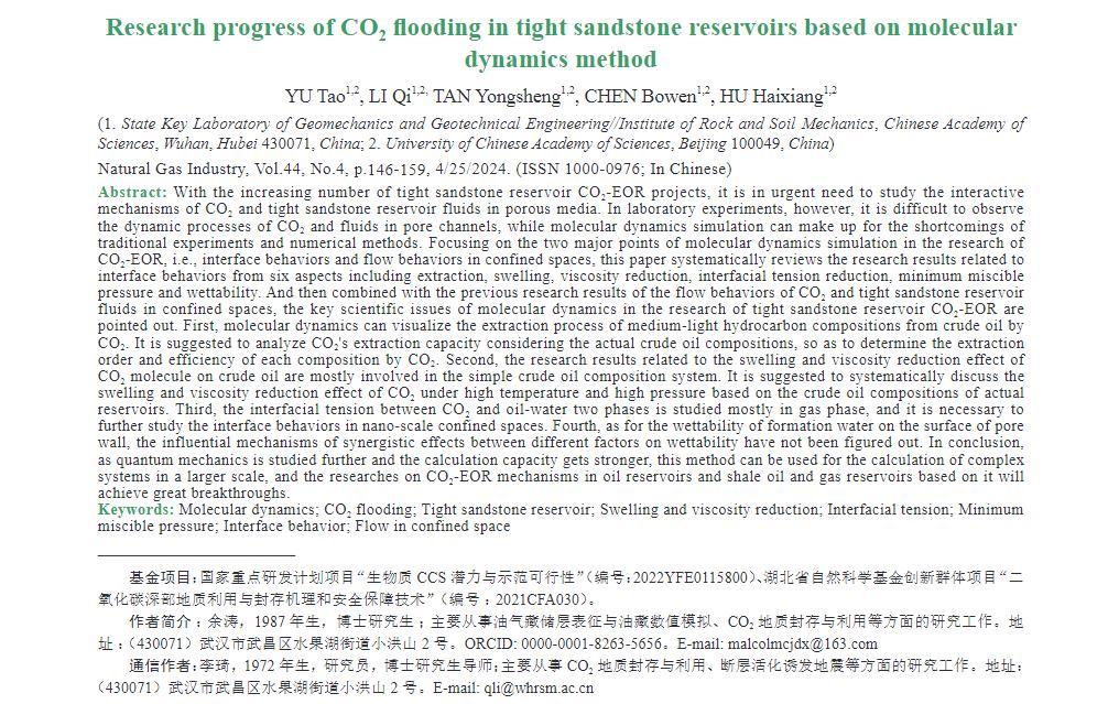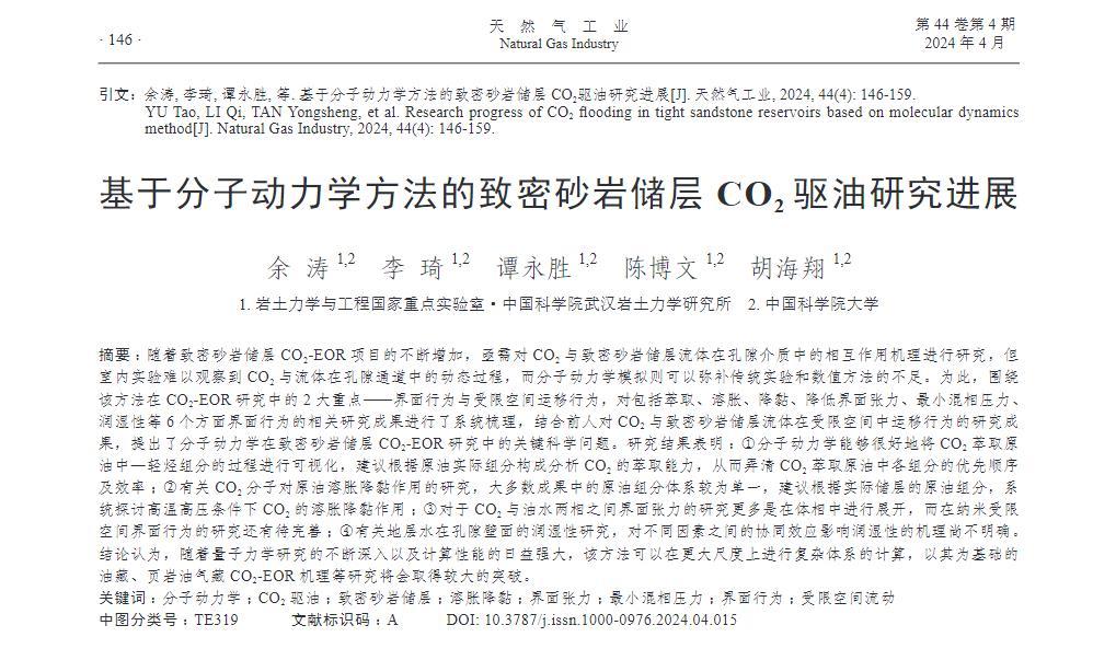 随着致密砂岩储层CO2-EOR项目的不断增加,亟需对CO2与致密砂岩储层流体在孔隙介质中的相互作用机理进行研究,但室内实验难以观察到CO2与流体在孔隙通道中的动态过程,而分子动力学模拟则可以弥补传统实验和数值方法的不足。为此,围绕该方法在CO2-EOR研究中的2大重点——界面行为与受限空间运移行为,对包括萃取、溶胀、降黏、降低界面张力、最小混相压力、润湿性等6个方面界面行为的相关研究成果进行了系统梳理,结合前人对CO2与致密砂岩储层流体在受限空间中运移行为的研究成果,提出了分子动力学在致密砂岩储层CO2-EOR研究中的关键科学问题。