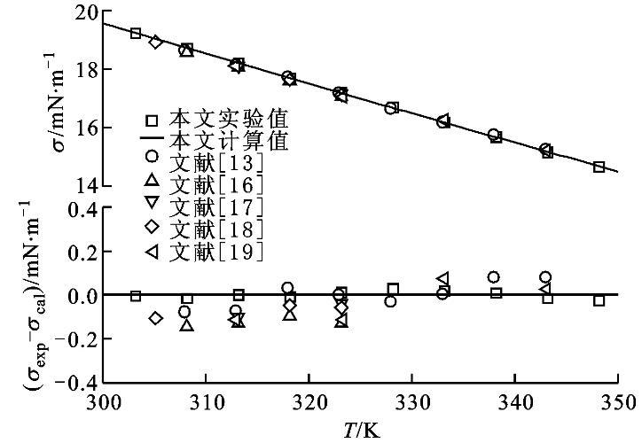 图3正庚烷表面张力实验值与拟合方程和文献值的比较