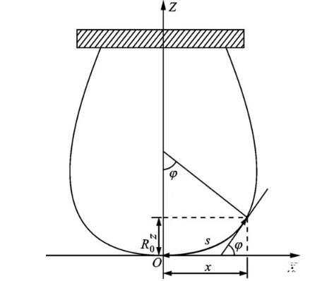 悬滴法利用测定处于重力与表面张力平衡状态的液滴外形,获得待测液体的表面张力。悬滴外形的几何关系如图1所示,在考虑液体静压作用的基础上,由经典Young-Laplace方程推导得归一化Bashforth-Adams工作方程为,式中:σ为表面张力;φ表示外形轮廓线某点切线与横坐标夹角;s为弧长;R0为顶点曲率半径;ρl、ρg分别表示液相和气相密度;g代表当地重力加速度,本文取为9.7965 m·s-2。