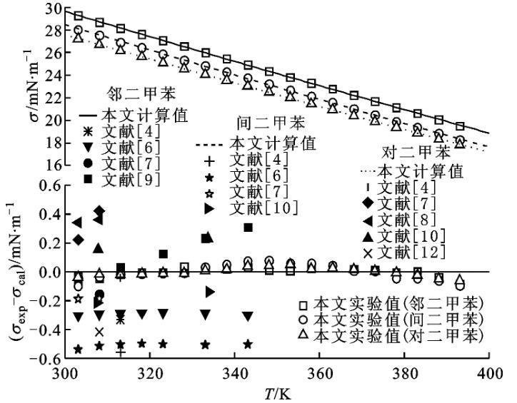 图4邻二甲苯、间二甲苯和对二甲苯表面张力与温度关系以及与方程计算值和文献值比较