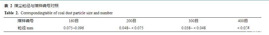 将EMI原液稀释至质量分数分别为0.1%、0.2%、0.4%、0.6%、0.8%、1.0%、2.0%、4.0%、6.0%、8.0%的混合溶液。实验煤样选取黄陵一号煤矿弱黏煤样,煤样工业分析结果见表1。在制备煤尘样品时,根据有关文献对黄陵一号煤矿综采工作面煤尘粒径分布进行检测,并结合国际标准化组织对粉尘粒径的定义,以及实验室制备条件,去除煤块外表皮,使用破碎机对煤心破碎60 s,用160、200、300、400目标准工业筛对煤粉进行筛分,共筛分出0.075~0.096、0.048~<0.075、0.038~<0.048、<0.038 mm共4个粒度范围的样品进行实验,其中煤尘粒径与煤样编号见表2。煤样制备完成后,将其放入80℃的真空干燥箱,真空干燥8 h后密封保存以备实验使用。