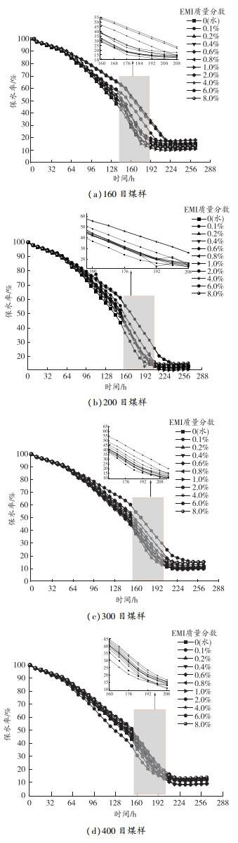 对比不同质量分数EMI溶液对不同粒径煤样保水率的影响曲线(见图9)可以发现,在160目测试煤样中,煤样在溶液中EMI质量分数为1.0%时静置,出现了析水现象。相比于160目测试煤样,200目和300目测试煤样分别在EMI质量分数为2.0%、6.0%的溶液中静置,出现了析水现象。160、200、300目3组测试煤样,在EMI质量分数小于6.0%的溶液的保水率在216 h后趋于稳定,400目测试煤样在208 h后趋于稳定;而在EMI质量分数为6.0%与8.0%溶液中,160、200、300、400目测试煤样分别在240、248、232、216 h后保水率趋于稳定,稳定时间均大幅提高。说明溶液中EMI质量分数越高,煤尘的保水效果越好。