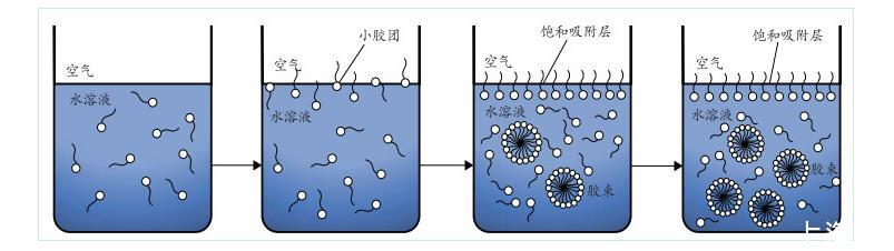 由图2可知,随着溶液中EMI质量分数的增大,表面张力持续降低。当溶液中EMI质量分数大于0.6%后,表面张力的变化趋势逐渐变缓,几乎维持在同一水平。出现这种现象的主要原因在于加入溶液中的EMI会对溶液的表面张力产生重要影响。EMI分子本身具有两亲性质,其中有机高分子会在溶液的表面形成吸附,并在液面定向排列,使疏水基扩展于空气中,亲水基则与水面吸附,溶液中EMI分子吸附状态随其质量分数变化情况如图3所示。吸附于水面的EMI分子达到饱和状态时,EMI溶液的胶束质量分数便达到临界值,EMI分子开始缔合逐步形成胶束聚集物,该质量分数即为溶液的CMC值。之后,继续加入EMI溶液,表面张力不再发生较大波动,溶液内逐渐缔合成更多稳定的胶束。