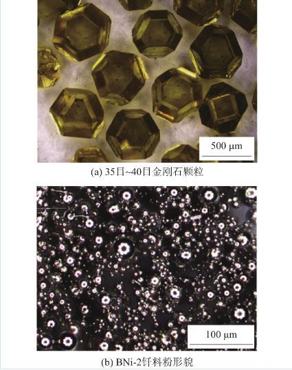 金刚石磨粒的抗压和耐磨性能与其自身品级有关,精选河南黄河旋风股份有限公司晶形完整、强韧度好、无缺陷的高品级HSD90型人造金刚石,图1为金刚石和BNi-2钎料粉的形貌,其中金刚石的原始形貌如图1a所示,所用粒度为35目——40目。钎涂试验前,利用角磨机或喷砂机清理基材表面,然后利用丙酮进行超声波清洗30 min,以避免试验过程杂质干扰,保证金刚石磨粒的透光性。钎涂试验基材为65Mn钢,激光钎涂试样尺寸为200 mm×100 mm×10 mm.钎料合金既要润湿金刚石和钢基材,形成冶金结合,又要兼顾耐磨性,与涂层硬质颗粒耐磨性能匹配。选用钎料合金为200目NiCrSiB(Ni82Cr7Si4.5B3.1Fe3,后文简称BNi-2)钎料,形貌如图1b所示。BNi-2钎料具有耐磨性好、成本低等优点,合金中Cr元素可大幅提高钎料/金刚石界面结合强度,B元素和Si元素的添加降低了钎料熔点,有助于减少金刚石热损伤。