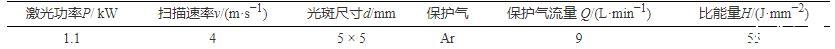 激光钎涂是利用激光作为热源使钎料层熔化,进而润湿并连接金刚石与基材的工艺,其原理如图2所示。与传统真空钎涂工艺相比,激光钎涂工艺可显著降低涂层能量输入,大大缩短热循环周期,具有非常好的结构和工艺适应性。文中激光钎涂试验系统包括功率为6 kW的LYS-6000-ST2型光纤激光设备和AcutEye型库卡轨道机器人。分别对钎料涂层和钎料/金刚石涂层进行激光钎涂试验。金刚石钎涂试验时,首先将BNi-2钎料铺在65Mn基板上,粉末厚度为0.5 mm,然后在BNi-2钎料层上沉积金刚石颗粒,随后在金刚石表面再预置一层0.5mm的粉末钎料。首先,预置1 mm厚度的钎料合金粉末层,然后进行钎涂试验,工艺参数如表1所示。试验过程中,利用激光钎涂系统配备的高速摄像机观察钎料层的熔化过程。使用Zeiss Smartzoom5型超景深显微镜对涂层形貌进行三维观察和尺寸测量。通过Image-pro plus 6.0软件对涂层超景深图片色域进行调整,直至色域所覆盖的区域为孔隙所占区域,测量方式选择Per area(单位面积)。