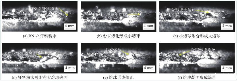 图3是激光钎涂过程中的超高速摄影照片(4000幅/s),直观地表征了激光钎涂过程中钎料粉末在激光作用下熔化、铺展、凝固的过程。从图3中可看出,在激光钎涂过程中,钎料呈现4种状态,分别为粉末态、熔球态、熔池态、凝固态。在激光未扫描的位置,钎料保持原始的粉末状态,如图3a所示。被激光束扫到的位置,粉末态的钎料吸收能量,升温熔化,形成尺寸较小的液态熔球,如图3b所示。随后,粉末钎料的不断熔化形成更多液态小熔球,尺寸较小的熔球互相结合汇聚成尺寸较大的液态熔球,如图3c所示。同时可观察到未熔化的钎料粉末在液/固界面张力作用下,逐渐被吸附到尺寸较大的熔球表面,如图3d所示。随着激光逐渐向前扫描,熔球不断长大,当熔球固相表面张力与重力的合力作用大于液/固界面张力后,大尺寸熔球在基体铺展润湿,形成熔池,如图3e所示。最后,随着激光热源的移动,激光后端的熔池温度逐渐降低,液态钎料逐渐凝固,在基体表面形成涂层,如图3f所示。
