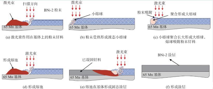 图4是钎涂粉末的熔合铺展过程示意图,结合以上观察分析,激光钎涂过程可分为5个阶段,分别是粉末熔化、液态钎料聚合、粉末吸附熔合、润湿铺展和涂层凝固成形。首先在激光作用下,钎料粉末吸收激光能量后温度升高,达到熔点开始熔化,形成液态小熔球。随激光热源向前推移,处在激光束前端的粉末钎料吸收能量后逐渐熔化形成更多液态小熔球,之后液态小熔球汇聚形成尺寸较大的熔球。未熔化的钎料粉末在液/固界面张力的作用下,逐渐由前端被熔球吸附,被吸附未熔化的粉末钎料热输入由两部分组成,分别是液态熔球的传热和吸收的激光能量,从而加快了钎料粉末的熔化速度。随激光热源的持续输入,更多钎料粉熔化,在基体表面形成熔池,并在基体表面润湿铺展。随激光持续向前推进,激光后端失去能量输入,加上吸附未熔化粉末导致的降温,熔池逐渐凝固,形成涂层。