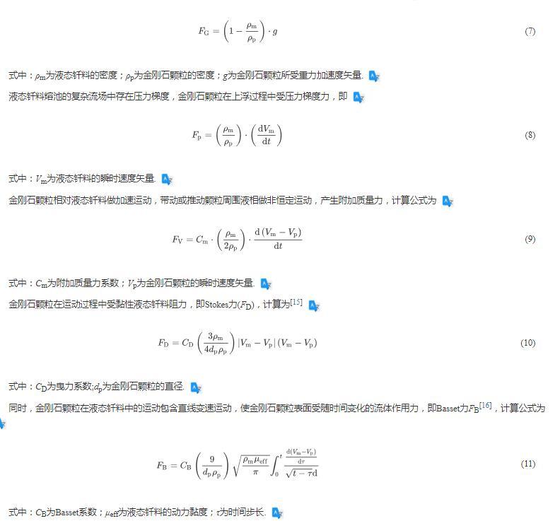 同时,金刚石颗粒在液态钎料中的运动包含直线变速运动,使金刚石颗粒表面受随时间变化的流体作用力,即Basset力FB,计算公式为