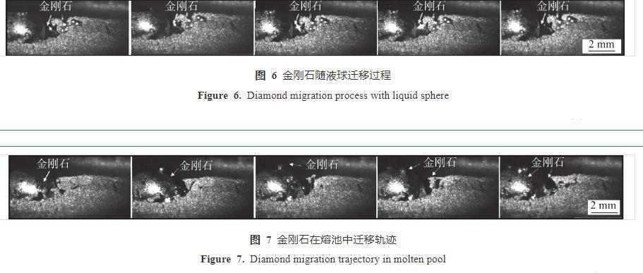 图8为金刚石置于钎料底部时,金刚石在激光钎涂过程中运动轨迹。可见,无论金刚石是直接铺置于钎料表面,还是置于钎料底部,在钎涂过程中,金刚石均会上浮到涂层表层。具体过程为在激光热源作用下,表层的钎料开始熔化成液态小球,由于金刚石的高透光性和高熔点,金刚石不会熔化。在液态小球聚集长大的过程中,金刚石沿着液球边缘运动,当液态小球汇入大熔球时,金刚石继续沿着大熔球的边缘向表面运动,最后凝固于钎料涂层表层。