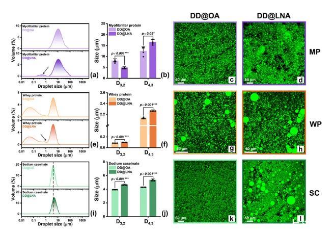 图7.乳液的形成特性:(a)MP,(e)WP和(i)SC乳液的粒径分布;(b)MP,(f)WP和(j)SC乳液的D3,2与D4,3;(c-d)MP,(g-h)WP和(k-l)SC乳液的激光共聚焦图像。*p<0.05,**p<0.01,***p<0.001