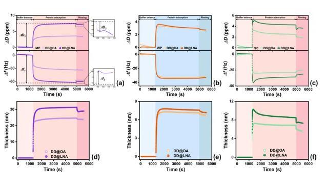 图6.QCM-D试验:(a)MP,(b)WP和(c)SC在不同饱和度界面上吸附时的共振频率迁移(Δf)与能量耗散迁移(ΔD);(d)MP,(e)WP和(f)SC在不同饱和度界面上形成的吸附层厚度