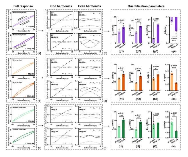 图5.非线性粘弹区域内(振幅30%),不同饱和度界面上(a)MP,(b)WP和(c)SC界面膜的利萨茹图像;通过GSD算法得到的(d)MP,(e)WP和(f)SC利萨茹图像的τ1,τ2,τ3,τ4分解组分;根据τ1,τ2,τ3,τ4计算得到的(g1-g4)MP,(h1-h4)WP和(i1-i4)SC的Eτ1L,Eτ1M,Eτ4模量与S-因子。*p<0.05,**p<0.01,***p<0.001