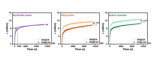 图4.线性粘弹区域内(振幅10%),不同饱和度界面上(a)MP,(b)WP和(c)SC界面膜的弹性模量;(d)MP,(e)WP和(f)SC界面膜的膨胀模量-界面压力关系图。*p<0.05,**p<0.01,***p<0.001