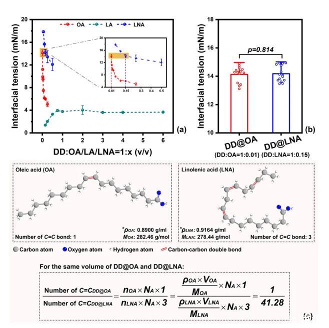 图1.模型油脂的筛选:(a)油酸/亚油酸/亚麻酸与十二烷不同体积比例复配后的油-水界面张力;(b)最终筛选得到的两种模型油相的界面张力(DD OA和DD LNA);(c)相同体积下,DD OA与DD LNA分子内的碳-碳双键比例