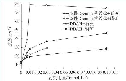 图2双酯Gemini季铵盐、DDAH与石英和磷矿作用接触角