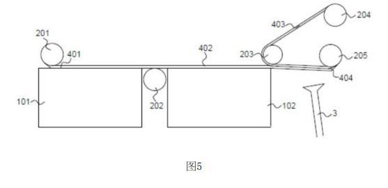 贴合辊203,设于清洗槽的尾端上方,清洗液的上表面与贴合辊底部之间的间隙不大于多层石墨烯薄膜与目标基底的厚度之和。当贴合辊旋转时,会将目标基底卷到多层石墨烯薄膜的上表面,借助摩擦力将目标基底与多层石墨烯薄膜贴合,得到石墨烯薄膜包裹的电化学阳极404;