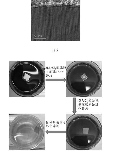 具体的,对于多层石墨烯/初始基底复合结构以初始基底为铜举例说明,实物如图2(a)、图2(b)所示,其截面如图所3示;蚀刻液选用FeCl3溶液。为便于本领域技术人员理解,以小尺寸多层石墨烯/初始基底复合结构的蚀刻过程进行展示,蚀刻过程如图4所示,从图4可看出,得到的多层石墨烯薄膜可自悬浮于液面上。