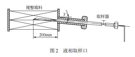 全塔共设有4个取样口。1#取样口设在塔顶回流处;2#取样口设在距填料底部1200mm处;3#取样口设在距填料底部400mm处;4#取样口设在填料段以下。填料段的取样口,即2#、3#取样口的样式如图2所示。取样器沿水平方向向上倾斜3°放置,伸入填料段的部分为半圆管,长度为200mm,直径为10mm。这样设计以保证液相样品顺利地由填料中取出,且取出的液相样品具有代表性。