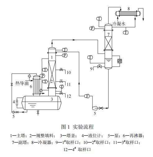 实验流程如图1所示。实验装置由主塔、副塔、冷凝系统、加热系统四大部分组成。主塔为内径400mm的不锈钢精馏塔,填料层装填高度1.8m,每盘填料高200mm,共9盘。主塔塔顶上升蒸汽及其冷凝液在副塔内进行换热,得到饱和的回流液,避免过冷现象的发生。塔釜再沸器采用热导油加热,换热面积为27.5m2。塔顶冷凝器采用冷却水制冷,换热面积为29.9m2。实验采用常压下的全回流操作。