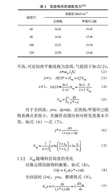 规整填料塔中,影响传质性能的因素很多,Zuiderweg等认为表面张力对传质的影响显著大于密度、黏度、扩散系数等其他物性。之后很多学者研究了表面张力梯度引起的Marangoni效应对精馏传质的影响,研究物系大多集中在能形成较大表面张力梯度的有机物水溶液。由于表面张力与其他物性密切相关,且表面张力对传质过程的影响机理相当复杂,至今没有一个满意的结论。近年来,精馏领域的传质过程研究主要集中在过程模拟,国内外对新型高比表面积规整填料的传质过程的实验研究还不多,有关工业尺寸的规整填料塔则更少涉及。