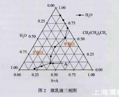 室内研究中选用表面活性剂和助表面活性剂组合(S+A)为Tween 80、十八烷基二甲基溴化铵和正丁醇,油相为正辛烷,乳化温度设为75℃时,制备WinsorⅣ型单相纳米乳液;其中,S+A与油相正辛烷按9∶1、8∶2、7∶3、6∶4、5∶5、4∶6、3∶7、2∶8和1∶9依次混合,然后逐滴加入蒸馏水,观察加入蒸馏水后乳液的澄清浑浊现象来确定H2O/(S+A)/正辛烷体系单相微乳液的微观结构类型,得到的相图如图2所示。选取三相图中A点的微乳液用蒸馏水定容稀释并以60 Hz频率超声波震荡5 min后,制得纳米乳液NR-A。