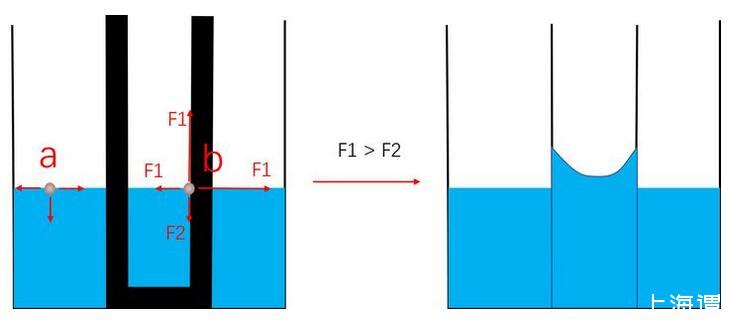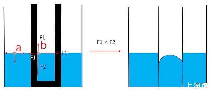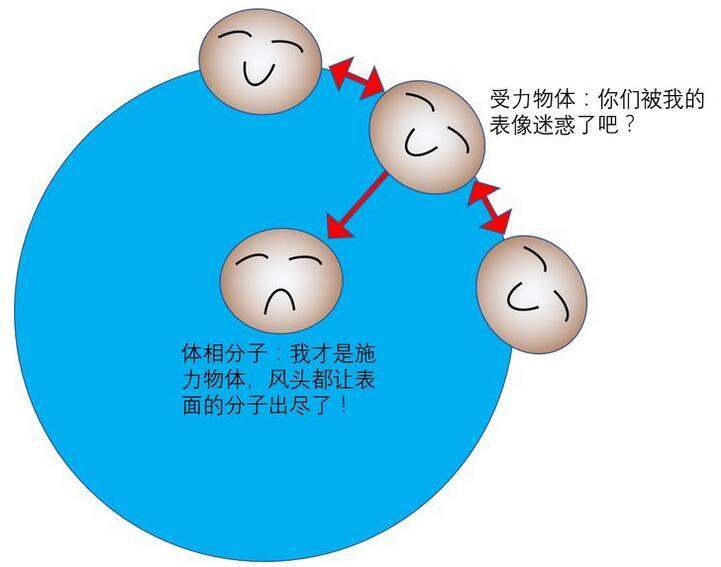 自由界面处的水分子只受到水分子的作用,如a处所示。而对于b处界面分子。其左侧的分子被固体分子替代,这个替代产生了固液分子作用力(F1)与液液分子作用(F2)的差别,这个差别使液面运动。