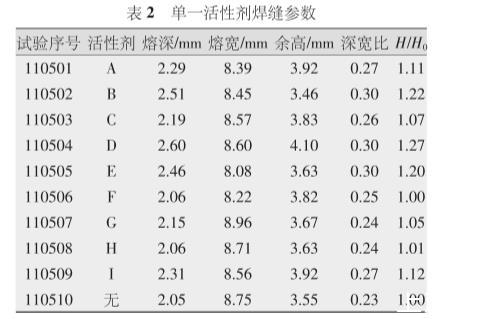 单一活性剂焊缝参数及无活性剂时焊缝参数如表2所示,表2单一活性剂焊缝参数,图1是单一活性剂熔深与无活性剂时熔深比直方图。