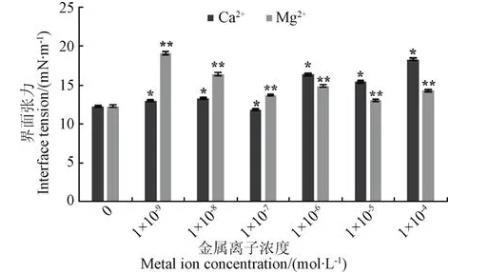二价金属子Ca2+、Mg2+对油水界面张力的影响见图4。由图可知,低浓度时,Ca2+对油水界面张力的影响较小;当Ca2+浓度达到1.00×10-4mol/L时,界面张力骤然增至18.3 mN/m;而Mg2+对界面张力的影响与Ca2+有相反的趋势,呈现低浓度促进,高浓度抑制的现象,该结果与于立军等的研究结果一致。原因在于在所试验温度的油水界面上,Ca2+和Mg2+形成不溶物的浓度明显不同,对油水界面张力产生影响的浓度范围也不同。