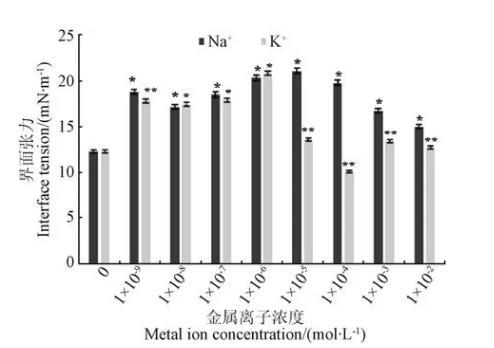 2)在麦胚脂肪酶的作用底物,即三油酸甘油酯(10-5mol/L)存在时,添加浓度分别为10-6、10-6、10-4和10-9mol/L的Na+、K+、Ca2+、Mg2+均可一定程度上降低油水界面张力的加入降低了三油酸甘油酯存在时的油水界面张力,其中,Mg2+的作用效果最明显(P<0.05)。当麦胚脂肪酶的作用产物油酸(5×10-4mol/L)存在时,添加NaCl和KCl可降低油水界面张力。添加CaCl2和MgCl2可升高油水界面张力,其中Na+的作用效果最显著(P<0.05)。