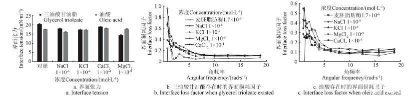 从图8b和图8c可以看出,三油酸甘油酯或油酸存在时,无机盐对tanδ的影响规律性较差,出现上述情况的原因可能是因为无机盐离子降低了麦胚LA在油水界面的溶解度,从而为三油酸甘油酯或油酸保留了更多的界面面积,有利于更多的三油酸甘油酯或油酸占据有效界面,以至于降低了底物或产物存在时的油水界面张力。