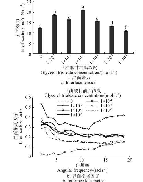 三油酸甘油酯浓度对油水界面特性的影响见图6。由图6可见,当麦胚LA浓度为1.70×10-6mol/L时,油水界面张力随癸烷中三油酸甘油酯浓度的增加呈现先增加后减小的变化规律;当三油酸甘油酯浓度介于10-5~10-3mol/L时,相同角频率时界面损耗因子随着浓度增加无明显变化规律。此外,在试验过程中,界面张力随时间延长呈现一定下降趋势,这说明麦胚LA与三油酸甘油酯的水解过程也会对界面张力产生一定影响。原因在于,在界面体系中,三油酸甘油酯可被麦胚LA水解,产生小分子的油酸等,三油酸甘油酯与麦胚LA组成的界面发生变化,进而影响界面特性。
