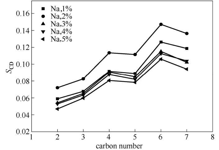 图8不同Na+浓度下疏水尾链碳原子序参数