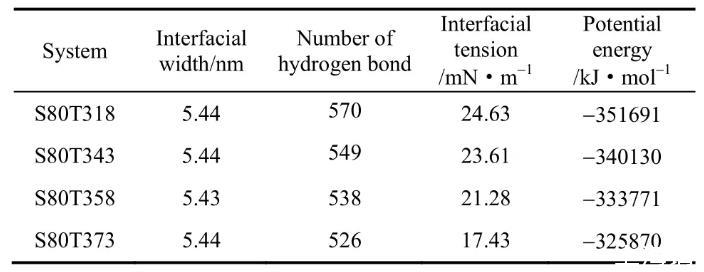 表2通过界面张力、表面活性剂与水的氢键数量、势能3组数据对比得出表面活性剂的界面张力随着温度升高而降低的结论。数据表明在4组模拟实验过程中,界面的宽度并没有发生改变。因此界面张力下降的主要原因是由于OPES势能的降低导致分子之间的作用力也随之降低。