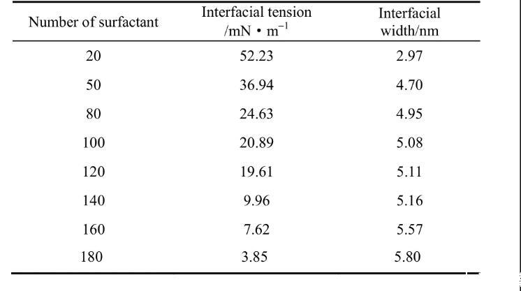 从表1可以发现表面活性剂数量的增加使得界面张力逐渐下降。其中当OPES数量由20增加到80时,界面张力值较高,这说明当表面活性剂浓度较低时并不能起到很好的降低界面张力的作用;随着表面活性剂数量进一步增加界面张力逐渐下降,当OPES数量为180时,达到临界饱和状态,此时界面张力仅为3.85 mN·m-1,此变化规律与真实实验规律相同。这同时也说明辛基酚聚氧乙烯醚磺酸盐可以很好地降低界面张力,是一种性能优良的表面活性剂。界面宽度用体系密度图中表面活性剂的密度曲线宽度来表示。随着表面活性剂个数增加界面宽度递增,起初界面宽度增加速度较快是因为界面OPES浓度过低并未饱和;当OPES数量达到100~140时,界面宽度仅有少量缓慢增加这是由于此时界面正在逐渐接近饱和状态。随着OPES的数量达到160和180时,界面宽度增加幅度变大,进一步验证此时界面已达到饱和状态。