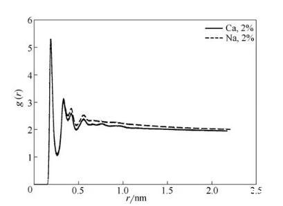图10中曲线分别代表在2%NaCl溶液、2%CaCl2溶液中磺酸基中的氧原子与水中氢原子之间的径向分布函数,如图所示两条曲线的峰值并未有太大差别,这说明OPES对Na+、Ca2+都有很好的抗盐性。