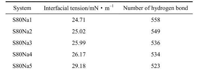 为进一步确定OPES的耐盐性能,可以再通过不同体系平衡状态时相应的界面张力和氢键数量来讨论,相关数据如表3所示。
