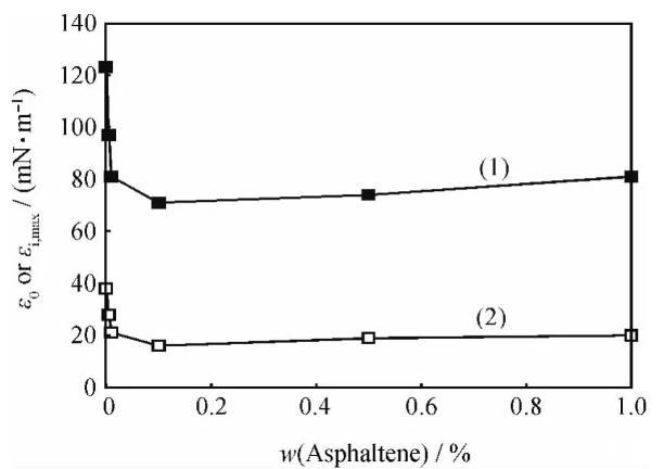 图8含不同量沥青质的煤油-1750mg/L HMPAM水溶液体系的极限扩张弹性(ε0)和扩张黏性最大峰值(εi,max)