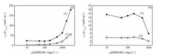 (2)在油-水体系中,原油酸性组分分子与HMPAM分子的疏水部分相互作用,阻碍界面网络结构的形成,大大降低了界面膜的扩张弹性和扩张黏性。
