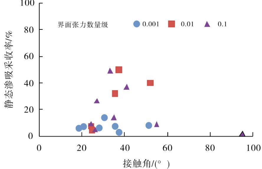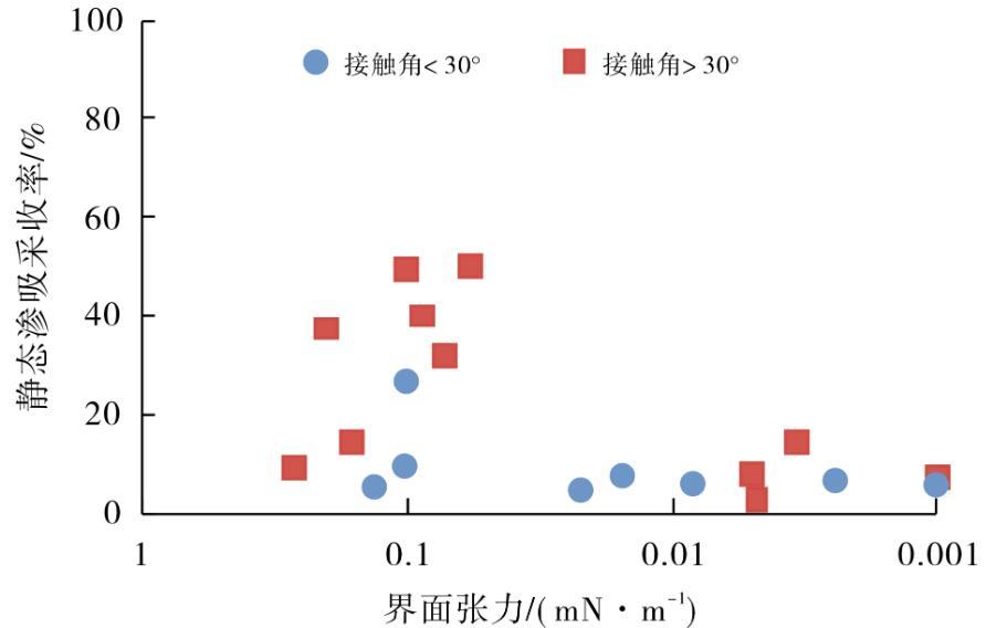 从图2中可以看出,表面活性剂的加入可以显著提高渗吸液的润湿性,从弱亲油转变为亲水,实验条件下接触角最多可以降低到19.3°,接触角对静态渗吸采收率的影响没有明显规律,低接触角不一定带来高的静态渗吸采收率,说明润湿性的影响主要使渗吸能够自发进行,由于不涉及油膜脱落等过程,润湿性改变黏附功的机理在静态渗吸当中作用很小。