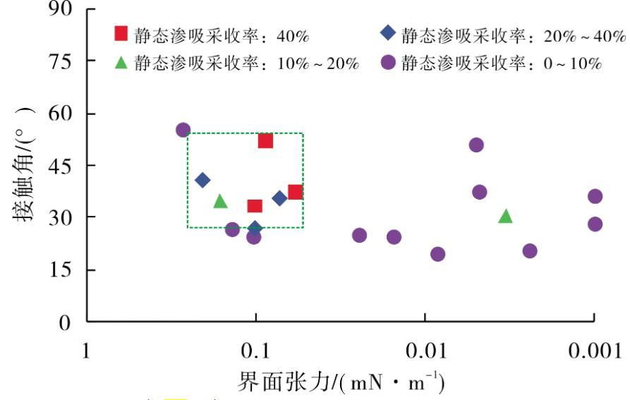 图3界面张力-润湿性-静态渗吸采收率关系