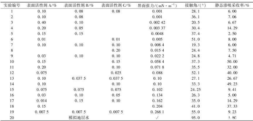 根据国内外学者的研究,渗吸液对渗吸的影响主要是改变油水界面张力、润湿性、乳化性和pH值。乳化性主要是通过乳化分散,从而增强油滴在岩心孔道内的流动能力;pH值则主要是影响渗吸液的乳化能力。本次实验采取静态渗吸的方式,乳化性的作用相对较小,故渗吸液配制指标为界面张力与润湿性。