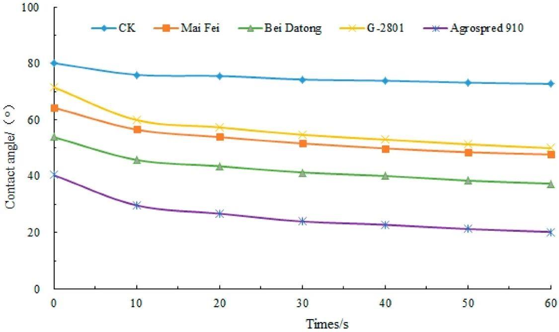 图2.水和不同助剂溶液在荔枝叶上随时间变化的接触角。