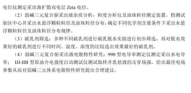 本文主要利用了OMEC PIP9.0型颗粒图像分析仪检测弱碱三元驱乳状液乳化程度;动态界面张力仪检测弱碱三元采出液油水界面动态界面张力;DHR-2界面流变仪测定弱碱三元复合驱采出液界面强度;ZetaPALS电位仪检测弱碱三元驱采出液扩散双电层电位;BT-9300H型激光粒度分布仪测定弱碱三元复合驱采出污水中悬浮固体粒径以及油珠粒径分布;多种不同破乳剂进行破乳脱水实验进行初步筛选,再对脱水效果好的破乳剂进行不同时间、温度、浓度的比较选出效果最好的破乳剂;990型电导率测定仪测定采出水电导率;IJJ-IIB型原油介电强度自动测试仪测试取样井在不同时期,不同化学剂含量下的击穿场强。