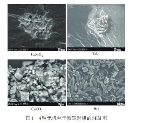 4种无机粒子的表观形貌如图1所示,可以看出,CaSiO3颗粒为多孔蜂窝状结构,Talc颗粒形状为偏平形,CaCO3颗粒形状不规则,WI多为针状形颗粒。