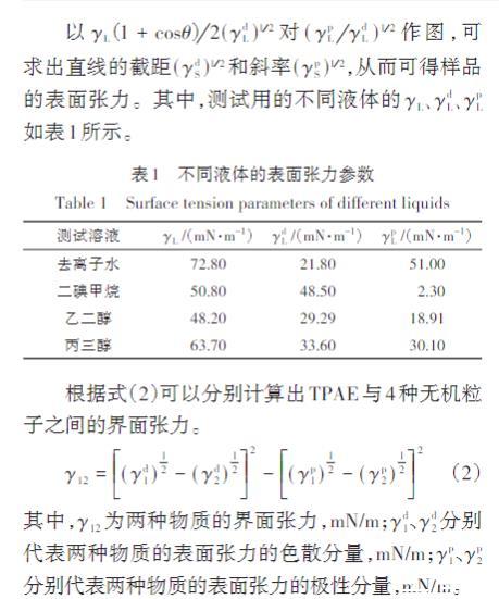 根据Owens-Wendt公式(1)来计算TPAE、Talc、CaSiO3、CaCO3、WI的表面张力γ。