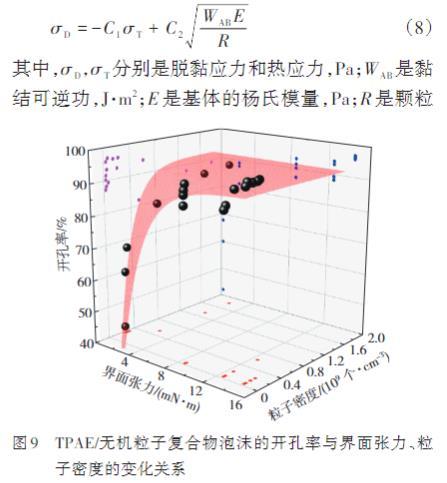 无机粒子与TPAE具有较高界面张力,并且粒子在TPAE基体中的分布密度较大时,复合物倾向于形成具有更高开孔率的泡沫。其中对于TPAE/CaSiO3复合物,CaSiO3的团聚现象导致的粒子尺寸增加也对泡沫的开孔率产生改善效果。此现象的理论依据可追溯至Vollenberg和Heikkinen提出的关于脱黏所需起始应力的公式(8)